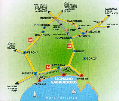 Autom prídete do Lignana rýchlo a pohodlne po diaľnici Viedeň-Graz-Klagenfurt-Vilach-Tarvisio-Udine-Lignano. Východ z diaľnice je pri mestečku Latisana (10 km od Lignana), ale tento východ je označený aj smerovou tabuľou s názvom Lignana. Z Martina do Lignana je to presne 830 km, z Bratislavy 630 km. |