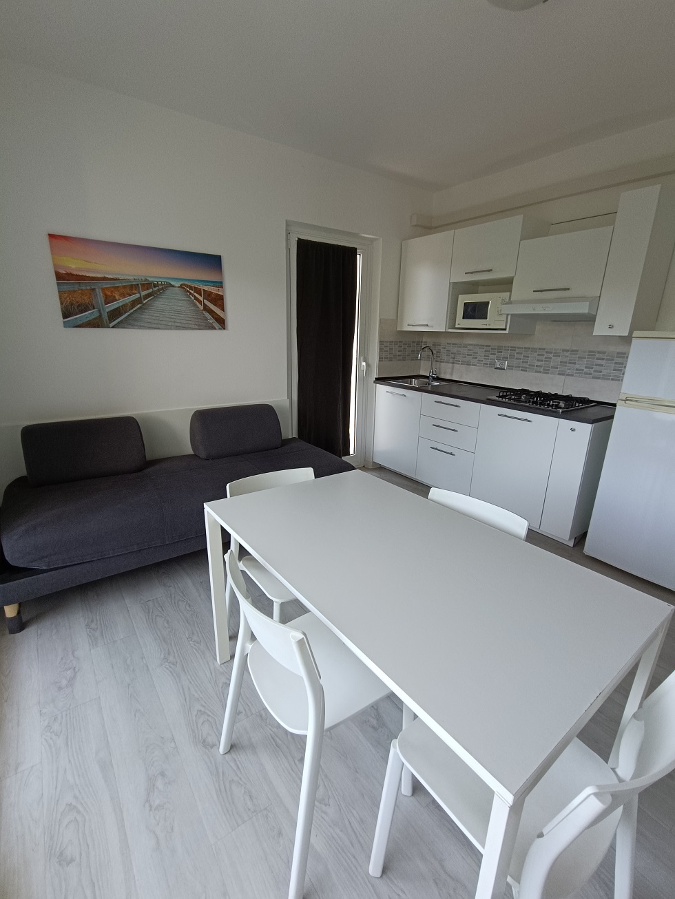 5-lôžkový apartmán : tvorí obývacia izba s moderným kuchynským kútom, jedálenským kútom a jedným lôžkom + jedna spálňa s manželskou posteľou + druhá spálňa s dvomi samostatnými lôžkami + nová kúpelňa so sprchovým boxom/bidetom/WC + druhá kúpelňa so sprch.boxom/bidetom/WC a + terasa zariadená záhradným nábytkom s bočným výhľadom na more.